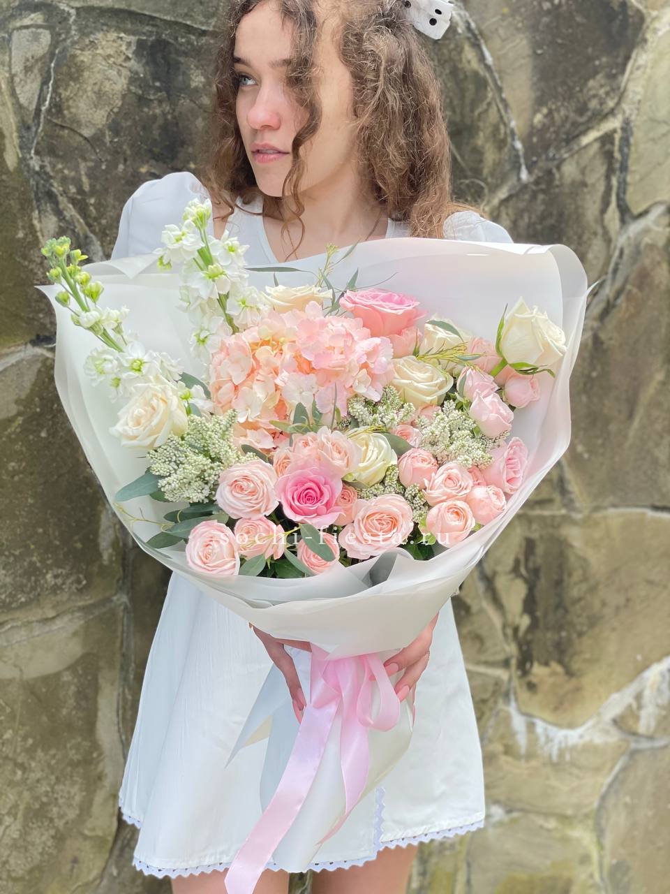 Пудровые розы и кустовые соцветия собраны с диантусами и озотамнусом в округлую форму. Шесть макаронс завершают композицию и создают ощущение домашнего уюта.