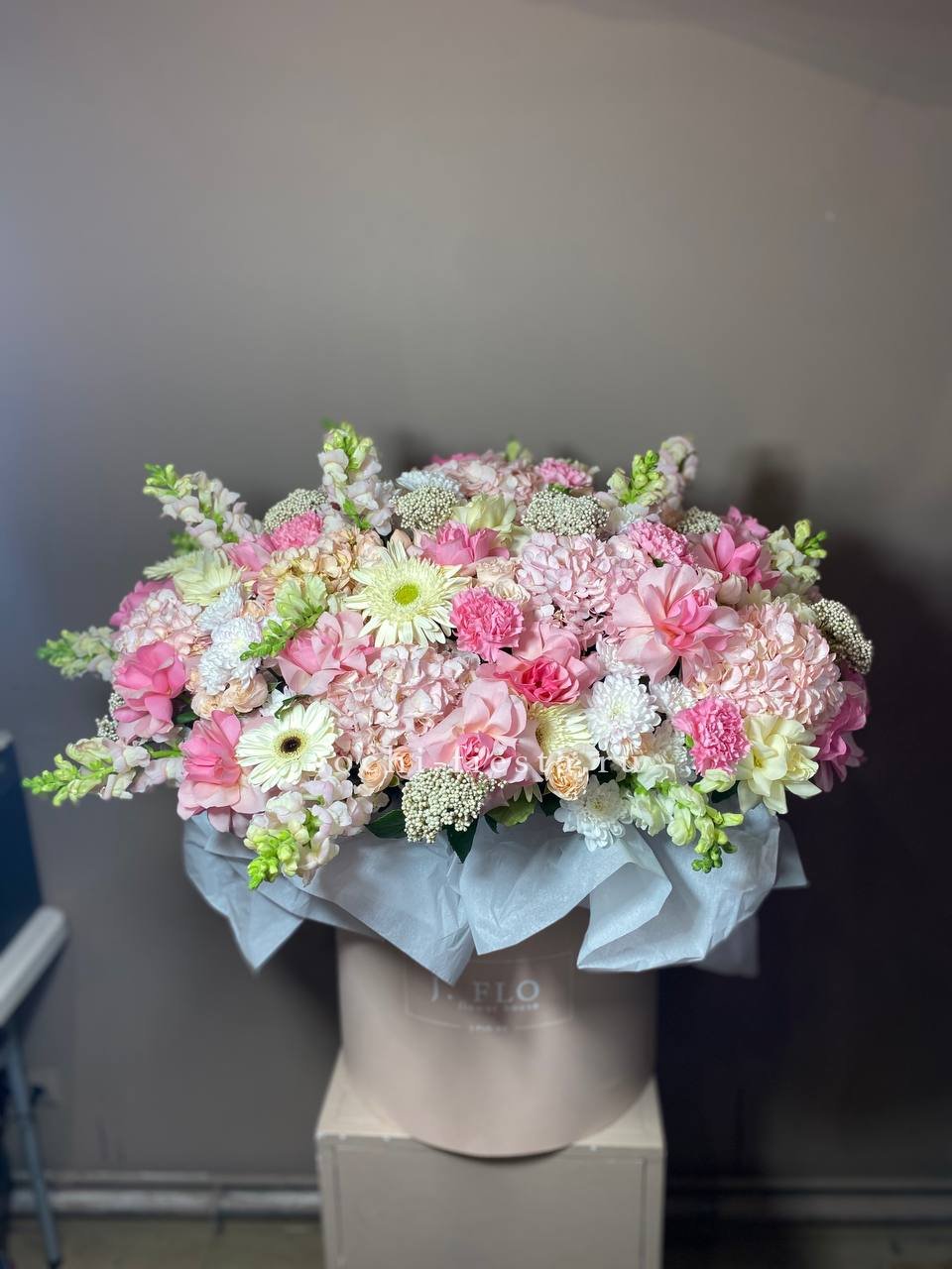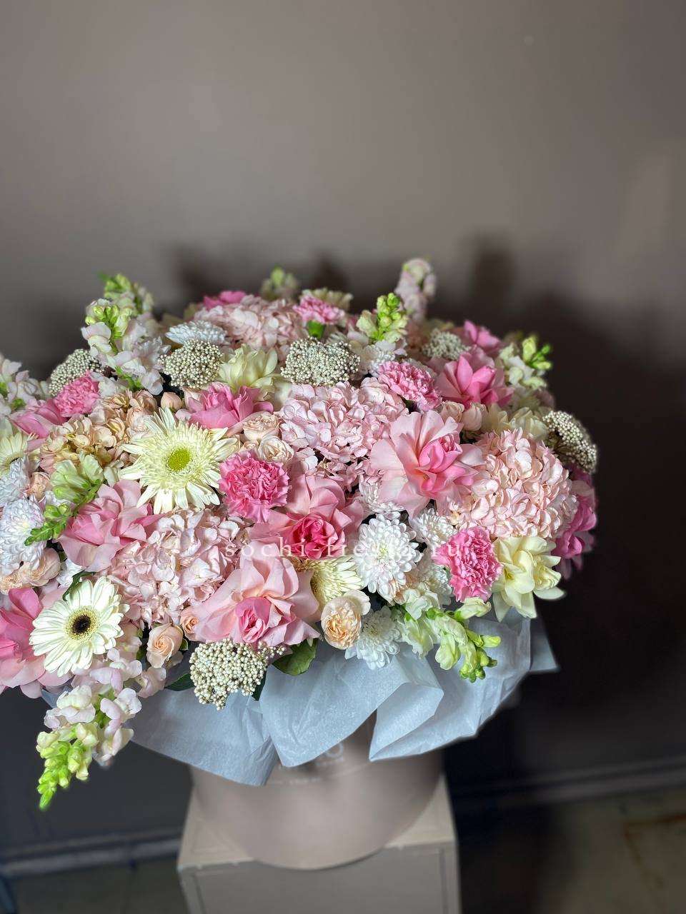 Сочетание пышной голубой гортензии и классических белых роз — это гимн нежности и чистоты. Букет, который не просто удивляет своим масштабом, но и дарит ощущение безмятежности. Идеальный выбор для самого искреннего признания.