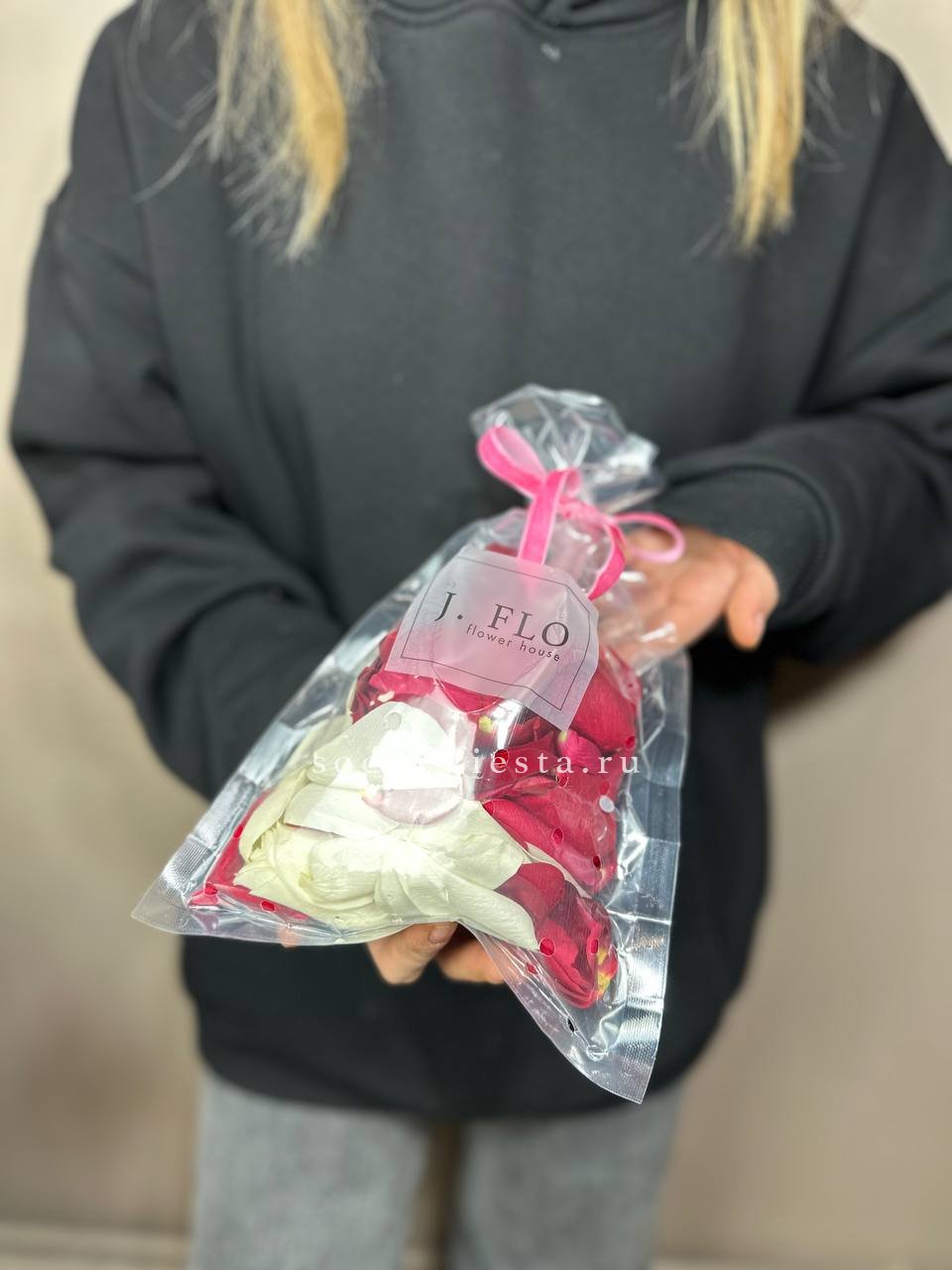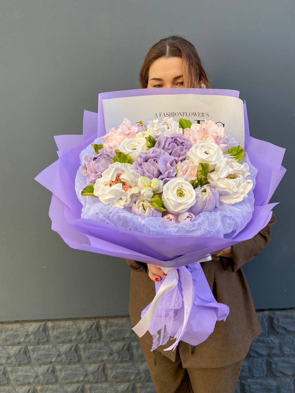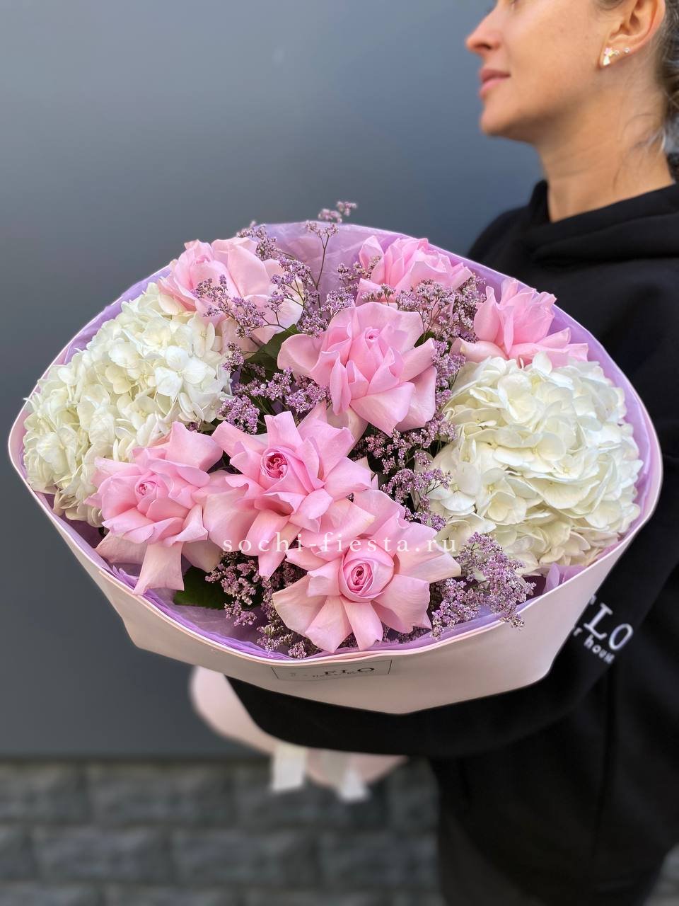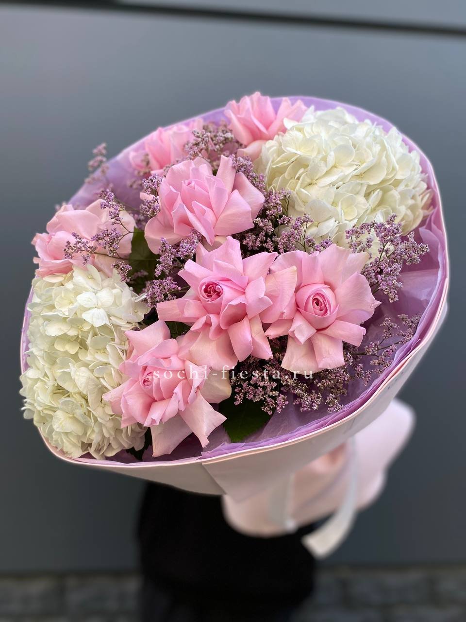 Гортензия и кустовые розы соединяются с веточками эвкалипта и ваксфлауэра в свободной композиции. Разная плотность соцветий создаёт живой ритм и природную лёгкость.
