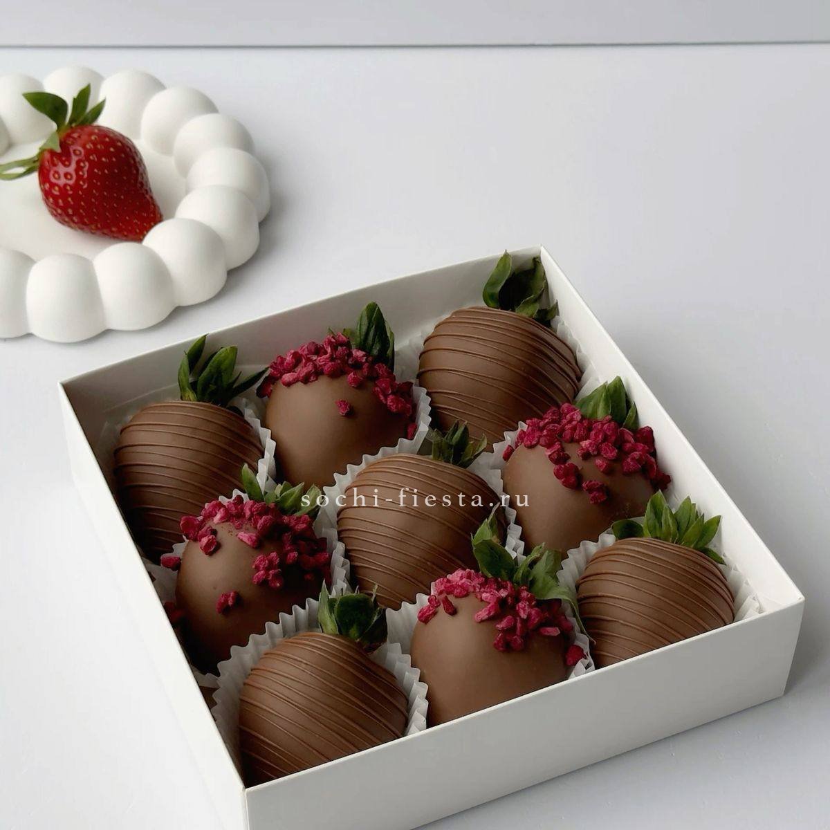 Девять отборных ягод в глянцевой оболочке бельгийского шоколада. Упругая мякоть клубники сохраняет свежесть под тонким слоем глазури. Лаконичная форма и ровный ряд создают графичное впечатление.