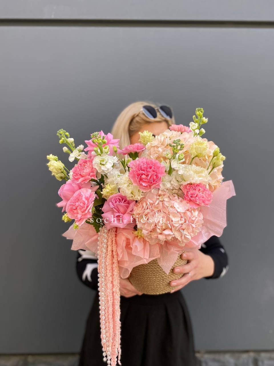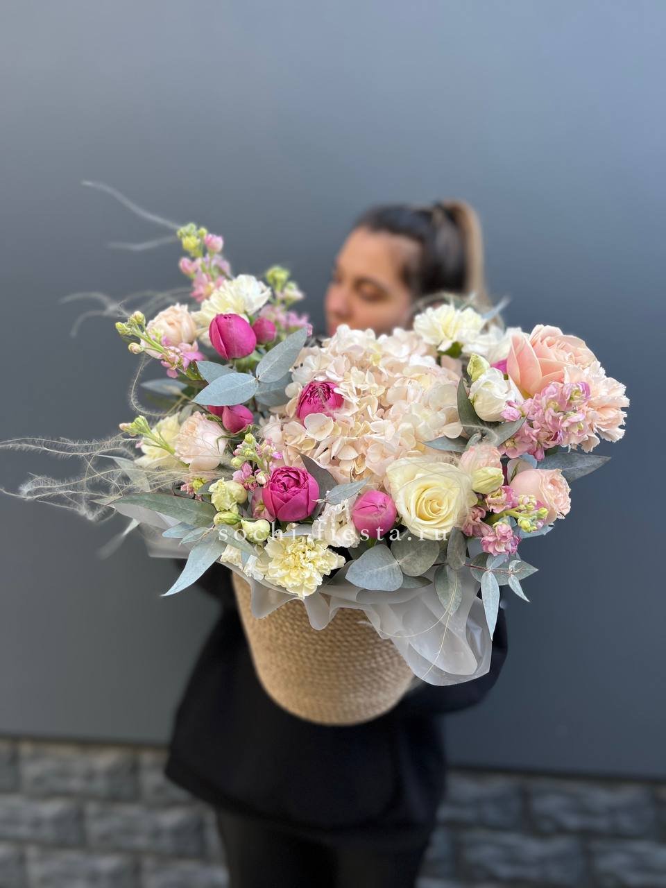 Живые гиацинты и свежие розы собраны в компактную композицию с природной текстурой джута. Корневая система сохранена, что позволяет цветам радовать дольше обычного букета. Готовое решение для дома или рабочего пространства.